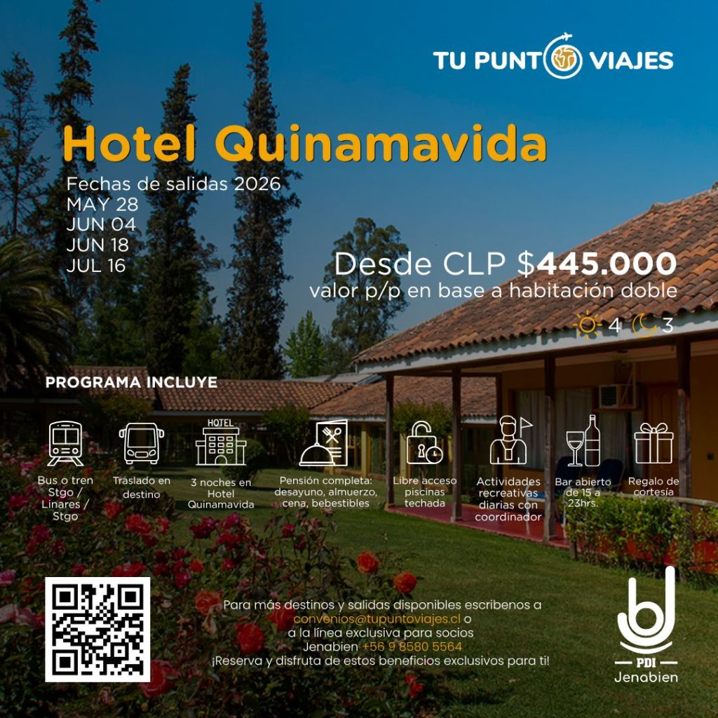 Las salidas programadas para 2026 son el 28 de mayo, 4 y 18 de junio y 16 de julio, con valores desde $445.000 por persona en base habitación doble o triple. Este precio exclusivo para socios Jenabien convierte a Quinamavida en una opción accesible y completa para quienes buscan combinar descanso, bienestar y entretención en un entorno privilegiado.