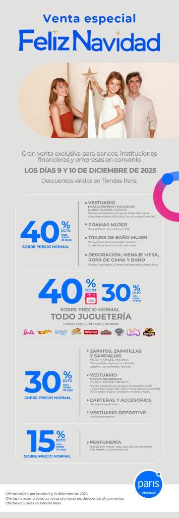 Los días 9 y 10 de diciembre de 2025, Tiendas Paris abrirá sus puertas con una Gran Venta Exclusiva pensada para que nuestros socios y socias Jenabien disfruten de beneficios únicos. Durante estas dos jornadas, podrán acceder a un 40% de descuento en vestuario de marcas propias y exclusivas para mujer, hombre e infantil, incluyendo pijamas y trajes de baño de mujer. Además, la promoción se extiende a artículos de decoración, menaje de mesa, ropa de cama y baño, ideales para renovar el hogar antes de las celebraciones de fin de año.