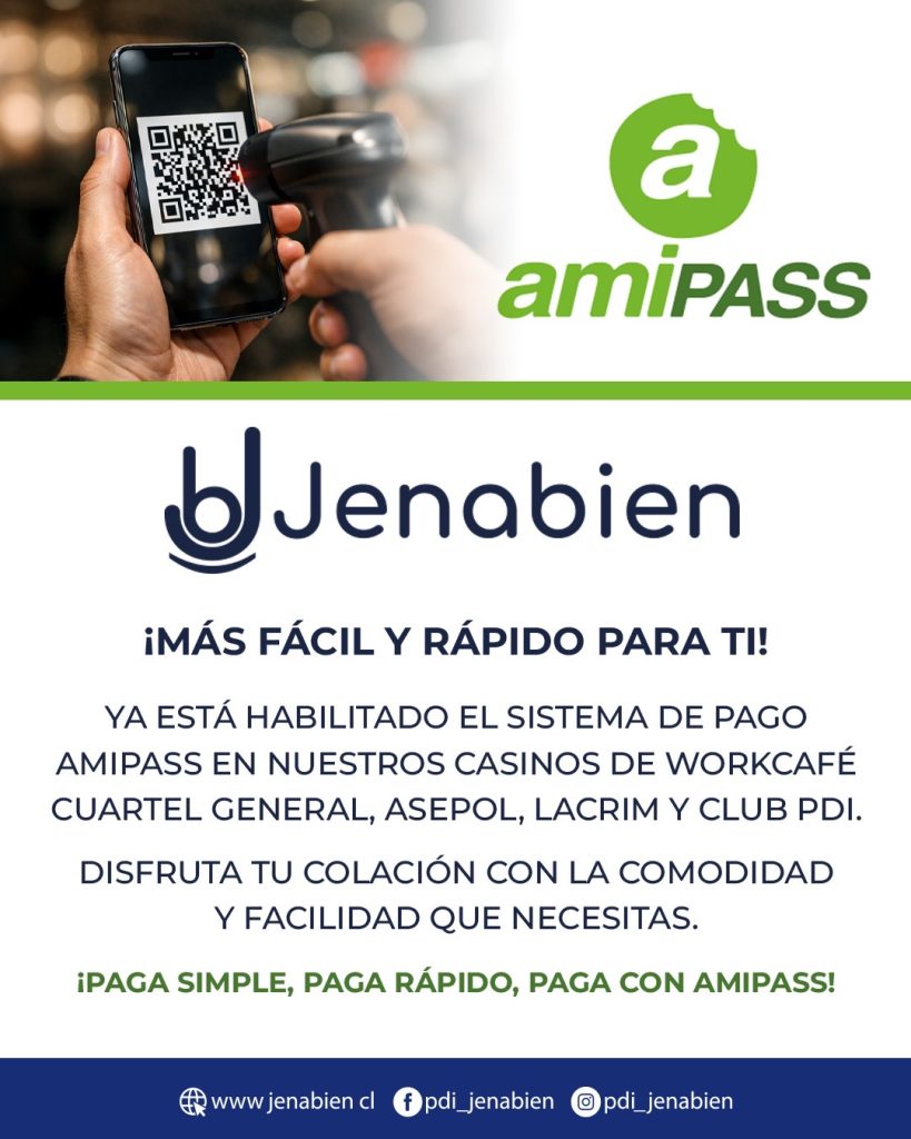En Jenabien nos complace anunciar que hemos incorporado una nueva forma de pago para nuestros socios y socias. Desde ahora, podrán utilizar el sistema Amipass, una herramienta práctica y segura que ya está disponible en nuestros espacios WorkCafé Mackenna, Asepol, Lacrim y Club PDI.