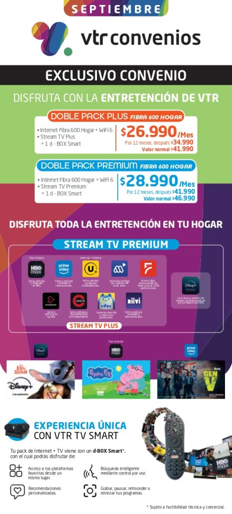 Gracias al convenio exclusivo entre Jenabien y VTR, nuestros socios y socias ahora pueden acceder a dos increíbles promociones que combinan conectividad de alta velocidad y entretenimiento de primer nivel, a precios preferenciales.