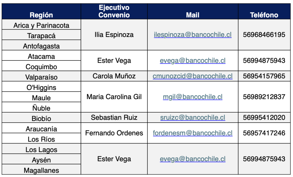 Con el objetivo de facilitar el acceso a este convenio, ponemos a tu disposición los contactos de ejecutivos de Banco de Chile en cada región, desde Arica hasta Magallanes, incluyendo nombre, número telefónico y correo electrónico. De esta manera, podrás contar con un acompañamiento especializado y directo para resolver tus consultas y aprovechar al máximo las ventajas de este acuerdo.