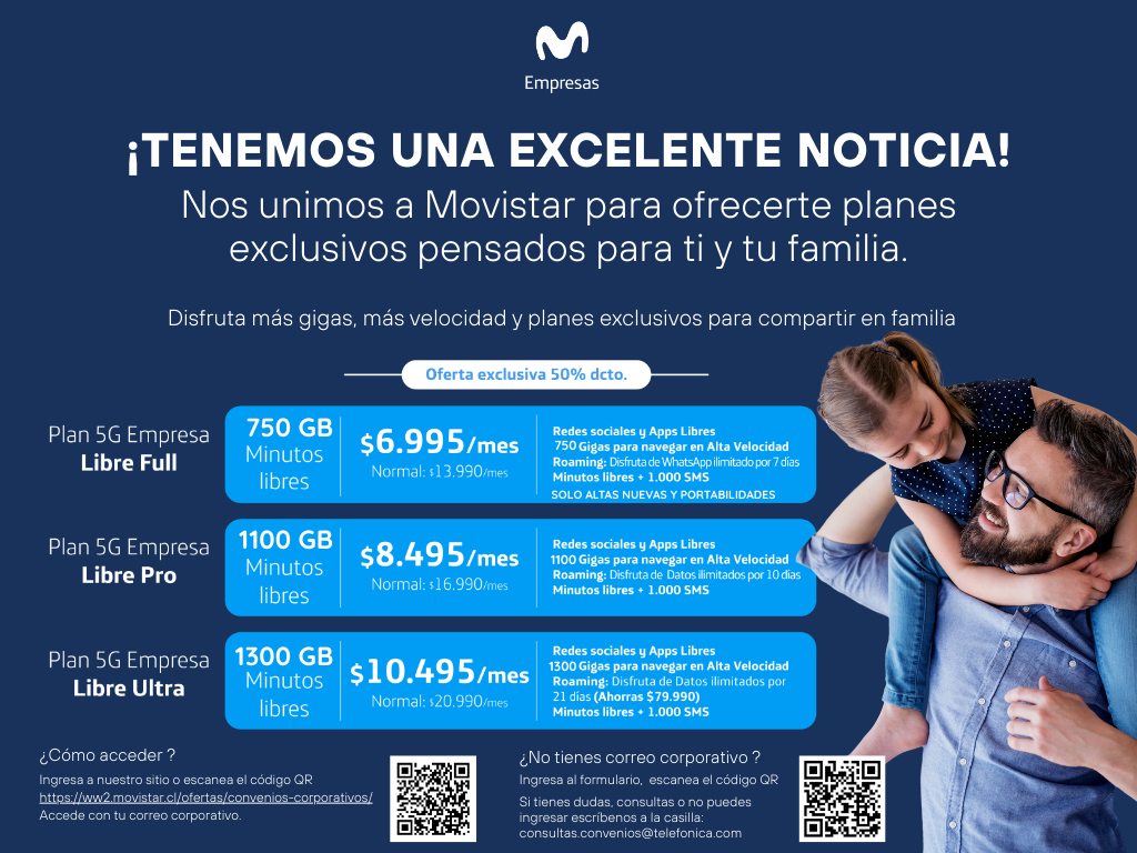 Esta nueva promoción refuerza el convenio con Movistar, entregando soluciones concretas de conectividad que responden a las necesidades actuales de comunicación, tanto en el ámbito laboral como familiar, y reafirmando el compromiso de seguir acercando beneficios de alto impacto a la comunidad.