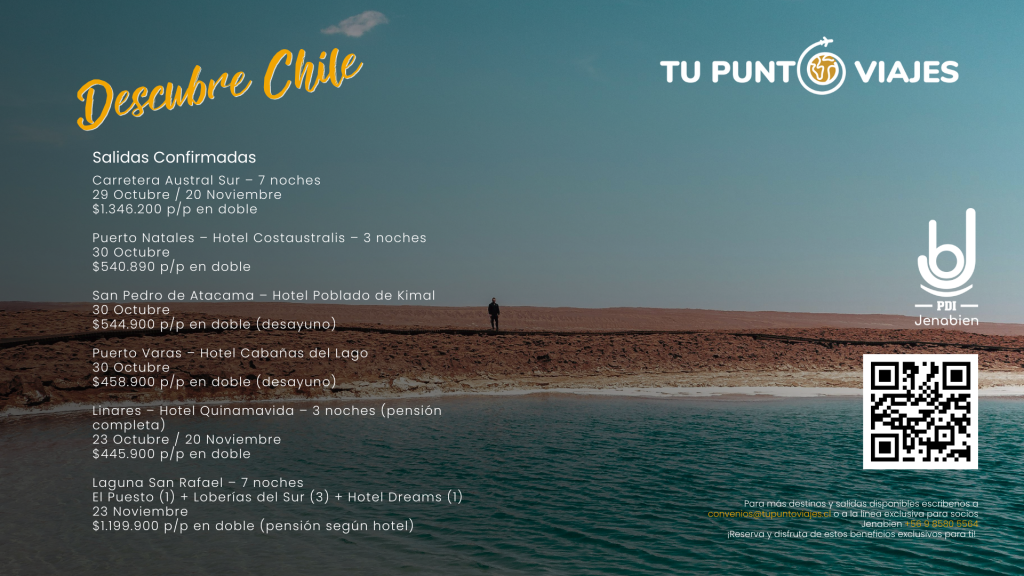 Gracias al convenio exclusivo entre Jenabien y Tu Punto Viajes, hoy más que nunca tienes la oportunidad de vivir experiencias inolvidables, tanto fuera como dentro de Chile. Esta alianza no solo abre las puertas a viajes internacionales, sino que también te invita a reconectar con la belleza de nuestro propio país, a través de destinos cuidadosamente seleccionados.