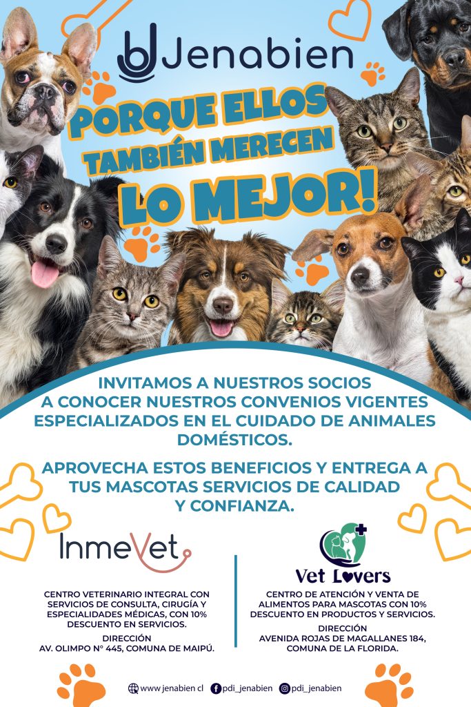 El pasado 4 de octubre conmemoramos el Día Mundial de los Animales, una fecha que en Jenabien nos invita a reconocer el amor, la compañía y el bienestar que nuestras mascotas nos entregan día a día. Sabemos que son parte esencial de nuestras familias, por eso queremos recordarte que, como socio Jenabien, cuentas con dos convenios veterinarios pensados especialmente para ti y tu grupo familiar.
