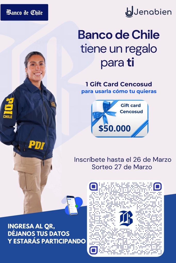 Banco de Chile está realizando un sorteo de una GiftCard Cencosud de $50.000, la cual podrá ser utilizada libremente en las tiendas adheridas. Para participar, solo deben escanear el código QR disponible en la grafica adjunta, ingresar tus datos y quedarán automáticamente inscritos en el sorteo.