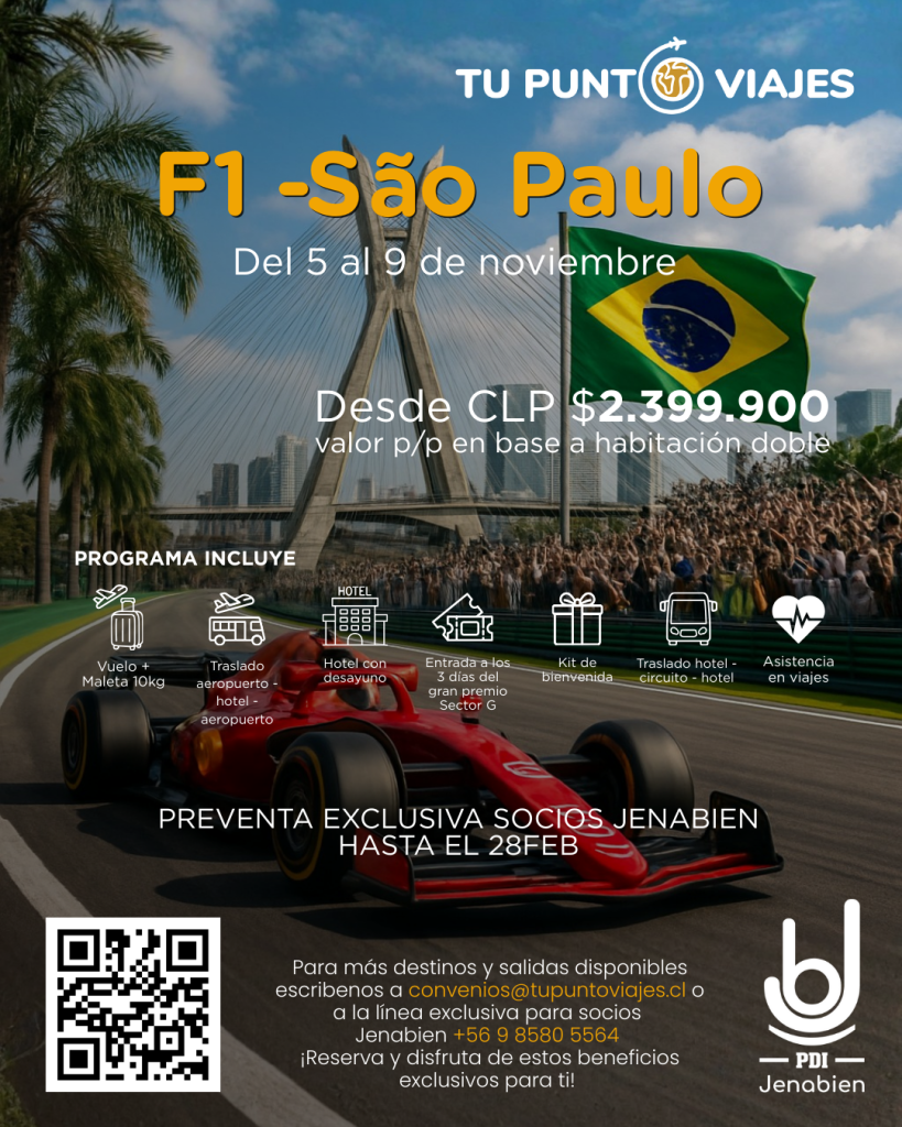 ¿Quieres vivir la experiencia de la Fórmula 1 en São Paulo a un precio conveniente? Esta es tu oportunidad gracias al convenio exclusivo entre Jenabien y Tu Punto Viajes. Del 5 al 9 de noviembre podrás disfrutar de un programa completo que te llevará directo al corazón del Gran Premio, con todo lo que necesitas para vivir la emoción de la pista sin preocupaciones.