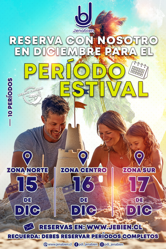 La temporada estival 2026 ya tiene fecha de inicio y con ella se abre el esperado proceso de reservas para los centros recreativos de Jenabien. A partir del 15 de diciembre, a las 12:00 horas, la plataforma digital estará habilitada para que lnuestros socios y socias puedan asegurar su estadía en los distintos destinos disponibles. Cada zona contará con un día específico de apertura, lo que permitirá un ordenado acceso a las reservas. Estas podrán realizarse directamente en el portal www.jebien.cl o a través de los teléfonos 227082263, 227082211 y 227082212.