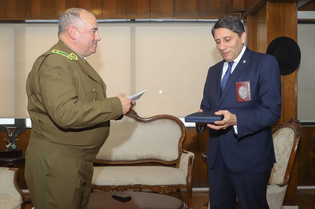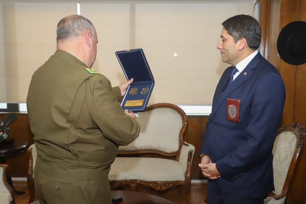 Durante el encuentro, ambos representantes sostuvieron una conversación cercana en torno a la importancia del acompañamiento brindado a las fuerzas policiales, destacando el rol fundamental que cumple el bienestar en la vida plena de quienes entregan su labor y compromiso diario al servicio de la ciudadanía. En la ocasión, el Prefecto Serón hizo entrega de una placa conmemorativa al General Martínez, reconociendo su destacada labor y el impacto de su gestión en la institución.