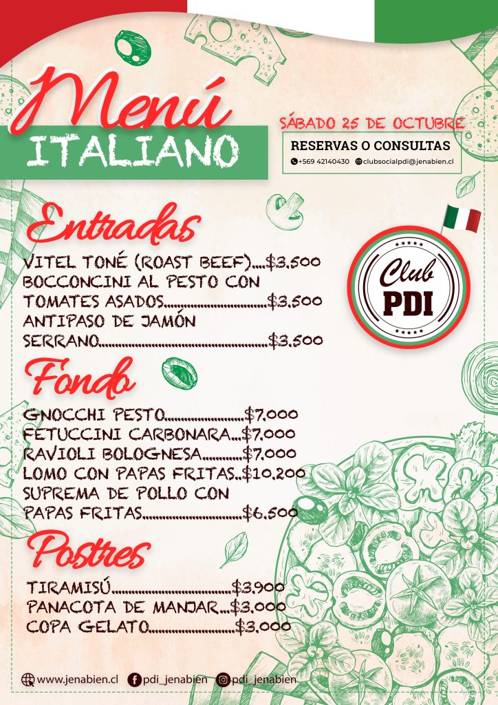 Porque nuestros menús temáticos llegaron para quedarse, este sábado 25 de octubre el Club Social PDI esta listo para recibir a sus socios y familias con una experiencia culinaria inolvidable. Esta vez, nos trasladamos directamente al país de la bota: Italia. Prepárate para dejarte envolver por los aromas y sabores que solo la cocina italiana sabe ofrecer.