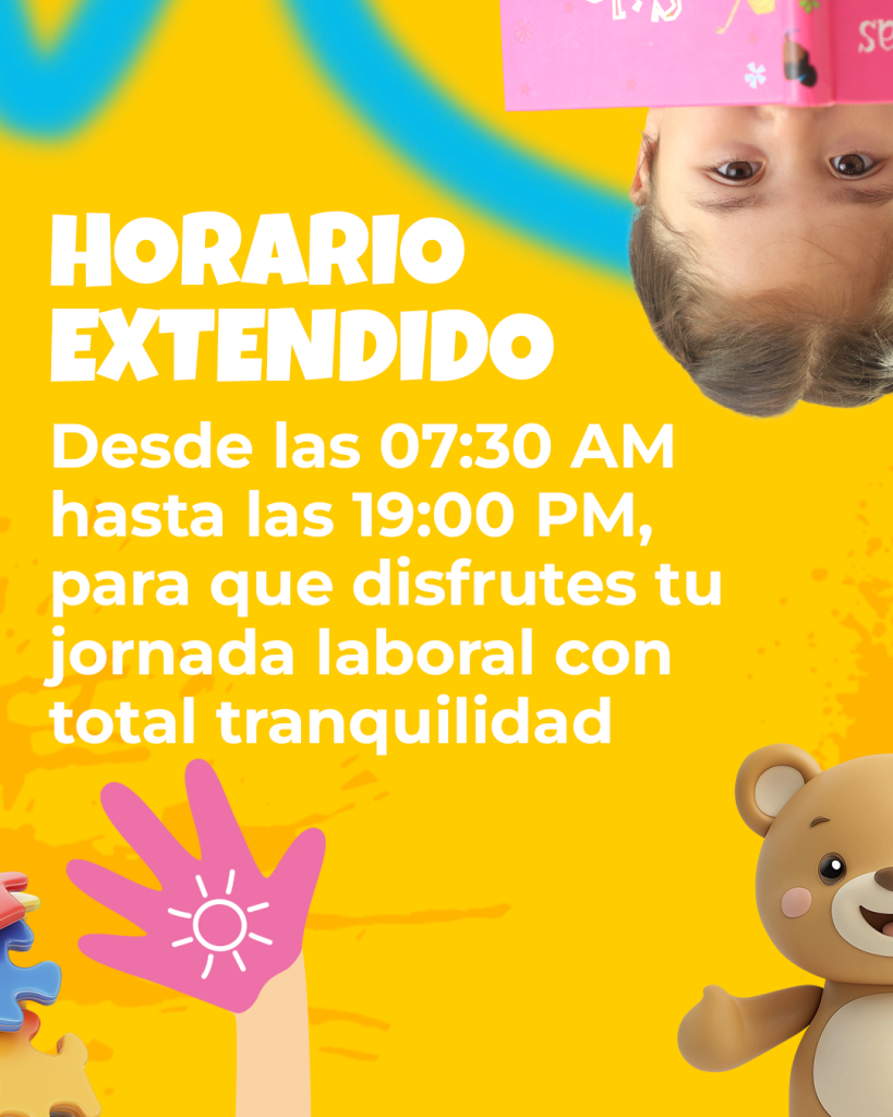 Nuestro horario va desde las 7:30 AM hasta las 19:00 PM, para que disfrutes tu jornada laboral con total tranquilidad, sabiendo que tus hijos están bien cuidados durante todo el día.