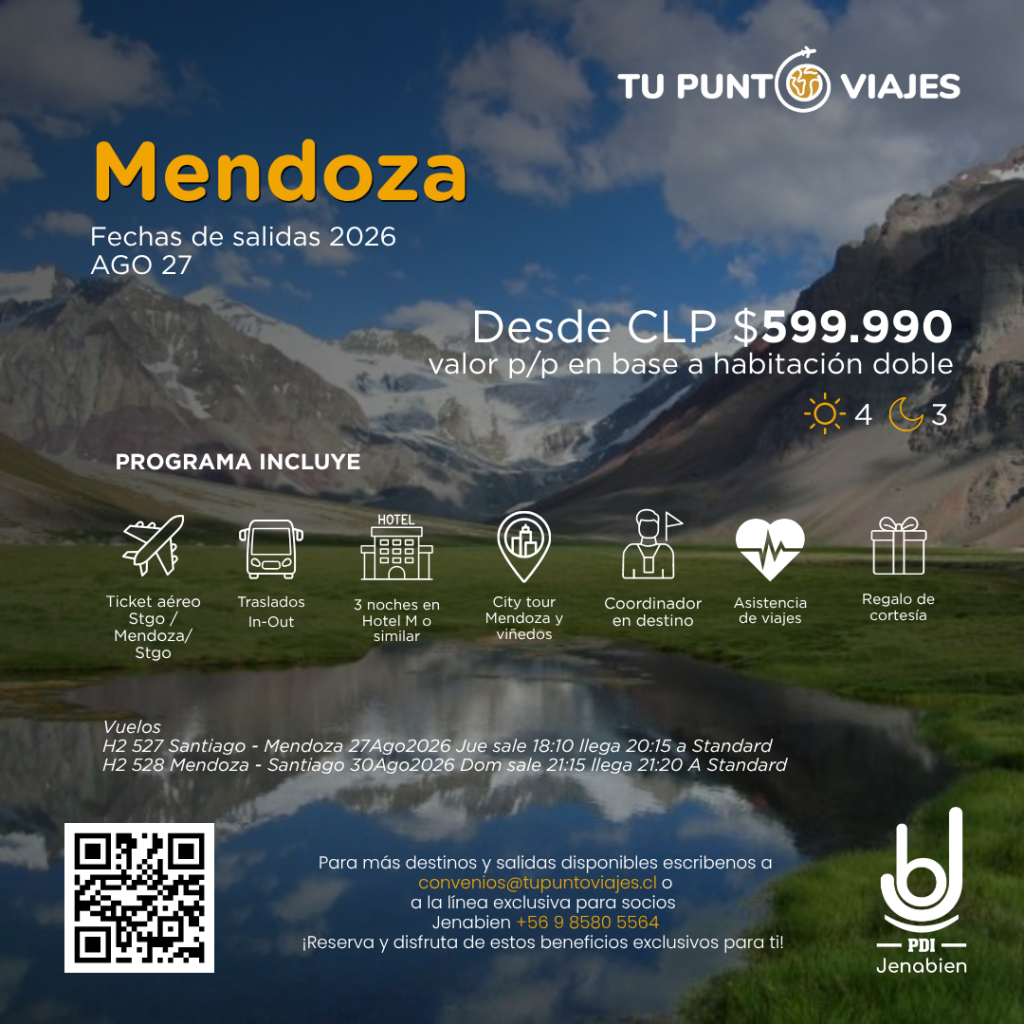 Un descanso nunca está de más, y por eso nuestra empresa en convenio Tu Punto Viajes trae una promoción exclusiva para las socias y socios Jenabien. Se trata de un viaje a Mendoza, Argentina, programado para el 27 de agosto de 2026, con un valor desde $599.990 por persona en base a habitación doble. Este programa incluye ticket aéreo Santiago – Mendoza – Santiago, traslados de llegada y salida, tres noches de alojamiento en Hotel M o similar, un city tour por Mendoza y sus viñedos, la asistencia permanente de un coordinador en destino, cobertura de asistencia de viajes y un regalo de cortesía para cada participante.